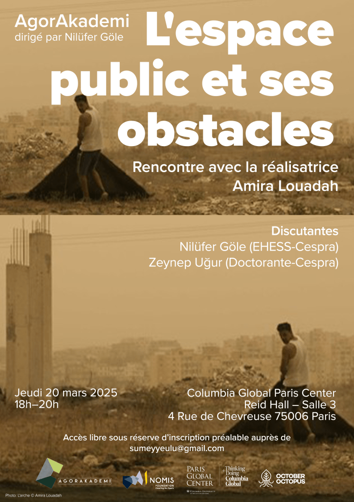 Dans cette rencontre AgorAkademi, Amira Louadah nous invite à prendre conscience des « obstacles », au sens propre comme au figuré, qui font partie intégrante de l’espace public. Elle porte un regard singulier et situé sur les rues détruites, les décombres, mais aussi sur les formes de domination, le colonialisme, la répartition des corps, les inégalités de genre et la question de la langue.